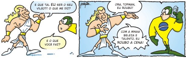 Eu simplesmente adoro as tiras de humor! O Topman nasceu nas tiras... Na verdade, como artista, prefiro muito mais desenhar tirinhas que histórias em quadrinhos! Gosto do poder de síntese delas, do humor rápido e direto! |